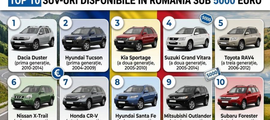 Piața auto second-hand din România oferă o varietate surprinzătoare de SUV-uri accesibile, chiar și pentru un buget limitat de 5000 de euro. Deși majoritatea modelelor din acest segment sunt mai vechi din 2004–2012. Multe dintre ele rămân opțiuni solide datorită fiabilității, costurilor de întreținere rezonabile și versatilității oferite.